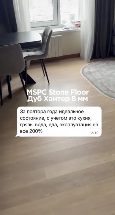 В качестве основного компонента в составе используется меденосная руда. Она подвергается специальной очистной обработке и дроблению. Из полученного сырья изготавливается минеральная фибра, внешне похожая на минеральную вату. Полученная фибра обрабатывается специальными адгезионными составами и спрессовывается под высоким давлением до плотности 1450 кг/м3. Если вы посмотрите на плиту Stone Floor в разрезе, то сможете увидеть небольшие живые блестящие вкрапления этого металла. Толщина ламели 8 мм: замковое соединение в разы крепче, чем у кварцвинила и spc и не боится незначительных дефектов стяжки пола.